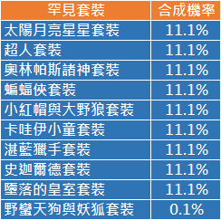 ◆10/9 (四) 維護後,罕見方塊嶄新的小鴨機率提升活動結束,使用罕見方塊操作合成時選擇【?】可獲得罕見時裝恢復原始機率,並更新如以下表格內容。