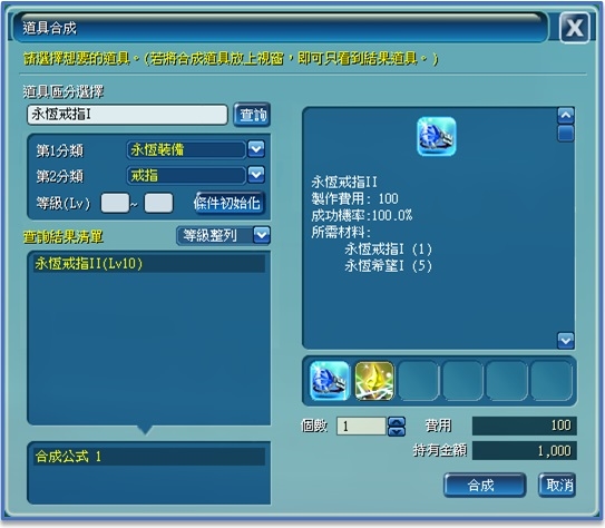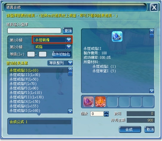 開啟道具合成視窗,可以在第一分類中選擇【永恆裝備】查看到。