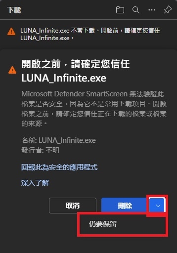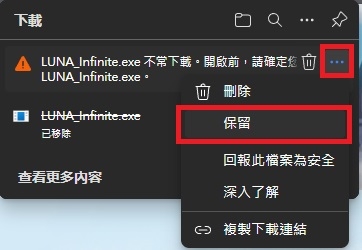 ◆ 使用Edge瀏覽器下載時若出現LUNA_Infinite.exe不常下載的訊息,