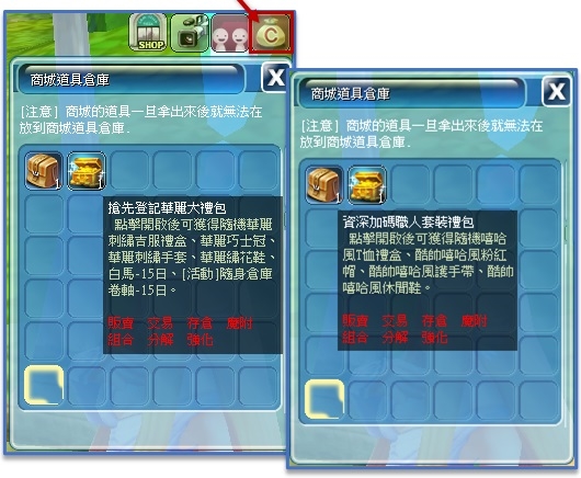 5.登入遊戲,開啟右上角錢袋按鈕的道具商城倉庫就可以看到獎勵囉!