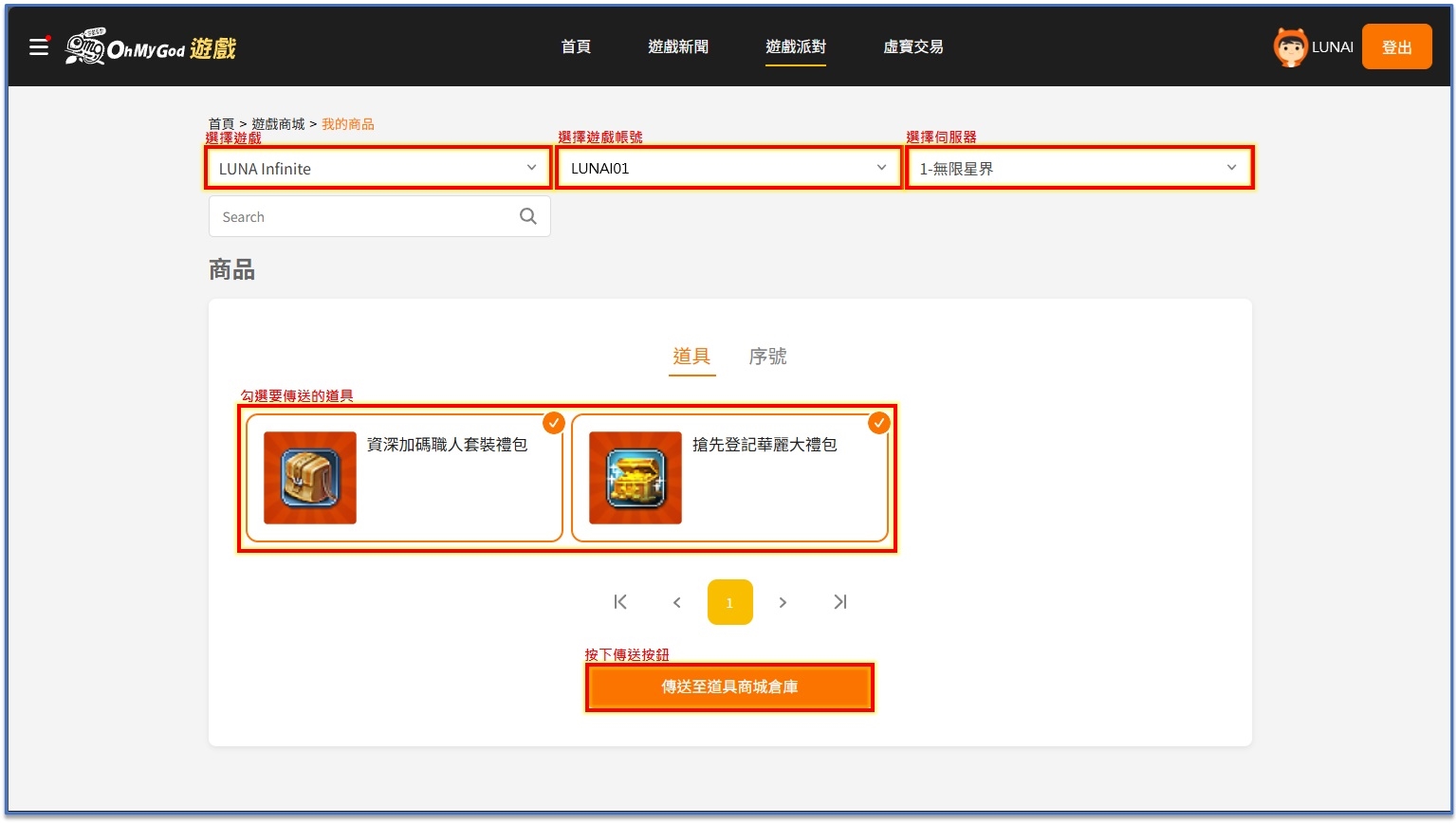 4.選擇LUNA Infinite遊戲、選取您的遊戲帳號、勾選要傳送的獎勵,點擊傳送至道具商城倉庫。