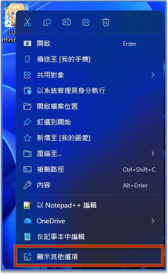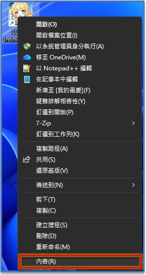①.使用滑鼠右鍵點選「LUNA Infinite 桌面捷徑」選擇「顯示其他選項」>「內容」。