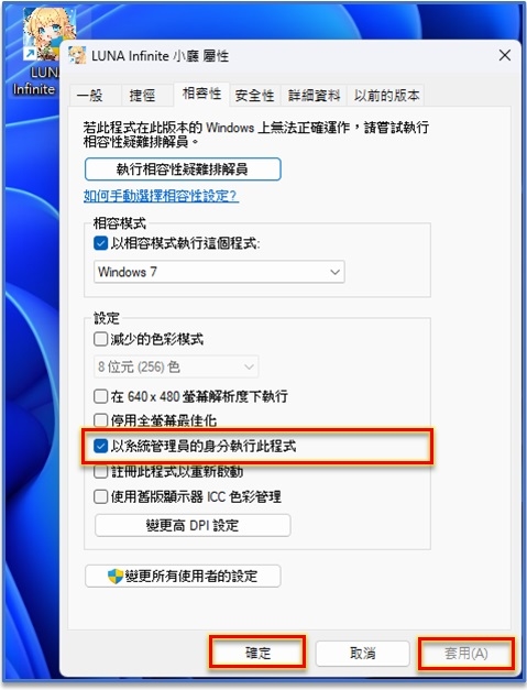*或是請直接點選桌面的「LUNA2 Infinite 桌面捷徑」選擇「內容」直接點「以系統管理員身份執行」即可登入遊戲。