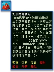 1、寶箱類商品為機會中獎道具,開啟後可隨機獲得乙項道具,不代表使用後即可獲得特定物品。
