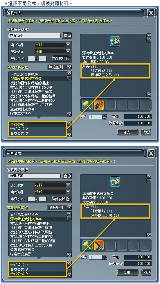 使用神奇鐵鎚與深海霸王系列武器與遊戲幣,在合成介面可兌換回【深海霸王武器交換券】。