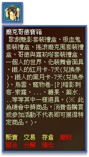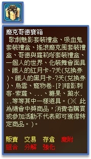 1、寶箱類商品為機會中獎道具,開啟後可隨機獲得乙項道具,不代表使用後即可獲得特定物品。