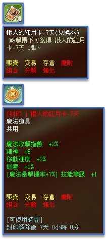 | 9 | 鐵人的紅月卡-7天(兌換券) | 1 | 1.00% |