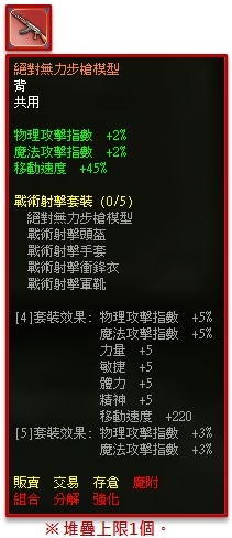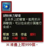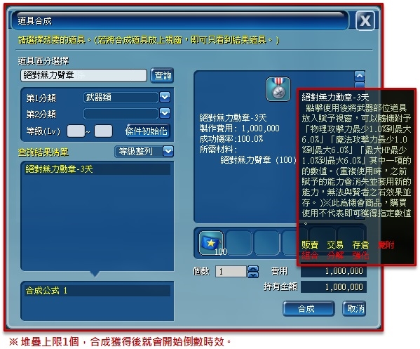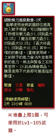 ※ 絕對無力高級勳章-3日,可使用於Lv1~105等級武器,使用後可隨機獲得下列其中一項能力隨機獲得下列其中一項(HP 提升 1% ~ 10%、魔法攻擊 提升 1% ~ 10%、物理攻擊 提升 1% ~ 10% ),重複使用時之前賦予的能力會消失並套用新的能力,無法與賢者之石等其他藍字效果並存。