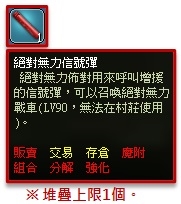 ※ 絕對無力信號彈 可交易,可存倉,不可販賣,堆疊上限1。