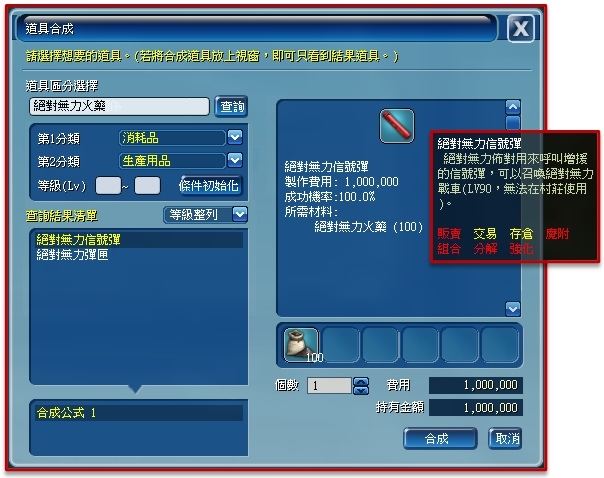 透過合成介面使用【絕對無力火藥*100】與遊戲幣1,000,000,可合成製作出【絕對無力信號彈*1】。