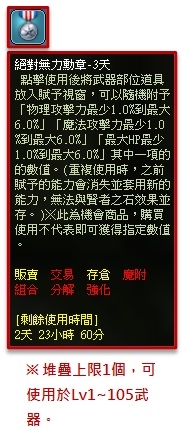 ※ 絕對無力勳章-3日,可使用於Lv1~105等級武器,使用後可隨機獲得下列其中一項能力(HP 提升 1% ~ 6%、魔法攻擊 提升 1% ~ 6%、物理攻擊 提升 1% ~ 6% ),重複使用時之前賦予的能力會消失並套用新的能力,無法與賢者之石等其他藍字效果並存。