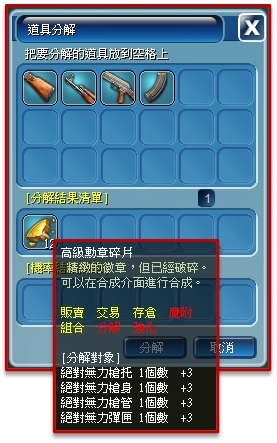 【絕對無力槍托、絕對無力槍身、絕對無力槍管、絕對無力彈匣】等材料分解後可獲得【高級勳章碎片】。