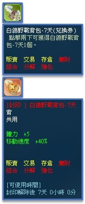 | 4 | 白鴿野戰背包-7天(兌換券) | 1 | 4.00% |