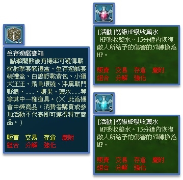 生存遊戲寶箱吸收組合 - 購買後可獲得 生存遊戲寶箱11個+[活動]初級HP吸收藥水5個+[活動]初級MP吸收藥水5個。
