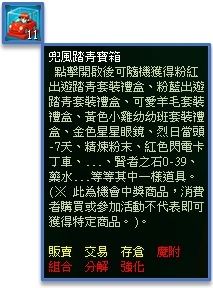 兜風踏青寶箱10+1:兜風踏青寶箱10+1個。點擊開啟後可隨機獲得粉紅出遊踏青套裝禮盒、粉藍出遊踏青套裝禮盒、可愛羊毛套裝禮盒、黃色小雞幼幼班套裝禮盒、金色星星眼鏡、烈日當頭-7天、精煉粉末、紅色閃電卡丁車、...、賢者之石0-39、藥水...等等其中一樣道具。(寶箱詳細內容點我看)