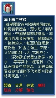 海上霸主寶箱10+1:海上霸主寶箱10+1個。點擊開啟後可隨機獲得帥氣船長套裝禮盒、潛水超人套裝禮盒、帝國華擊套裝禮盒、海灘渡假風套裝禮盒、藍點點魚、精鍊粉末、帕亞納伽翅膀、寵物卷-[P]雪之領主-伊菈、艾莉絲趴娃-7天(兌換券)、...、深海霸王武器交換券、藥水...等等其中一樣道具。(寶箱詳細內容點我看)