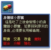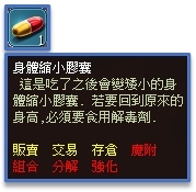 ▲ 身體縮小膠囊: 1入,這是吃了之後會變矮小的身體縮小膠囊。若要回到原來的身高,必須要食用解毒劑。