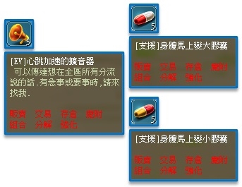 內含拜年必備利器:[EV]心跳加速的擴音器*5、新年全場焦點最需要的:[支援]身體馬上變大膠囊*5、躲避三姑六婆追問最好用的:[支援]身體馬上變小膠囊*5!