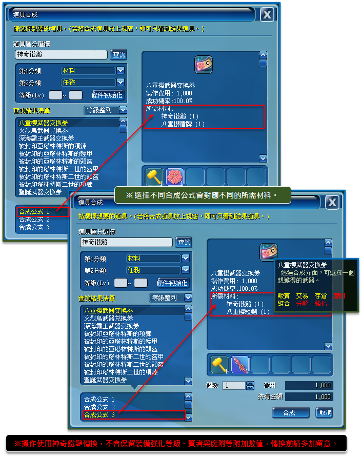 ★ 在合成介面使用神奇鐵鎚與八重櫻系列裝備,可還原為八重櫻武器交換券。