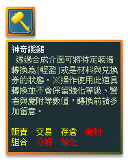 ※ 操作使用神奇鐵鎚轉換裝備並不會保留強化等級、賢者與魔附等其他附加數值,轉換前請多加留意。