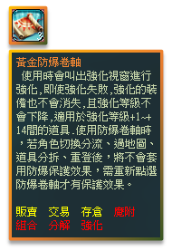 ※ 使用防爆卷軸時,若角色切換分流、過地圖、道具拆分、重登後,將不會套用防爆保護效果,需要重新點選防爆卷軸才有保護效果。